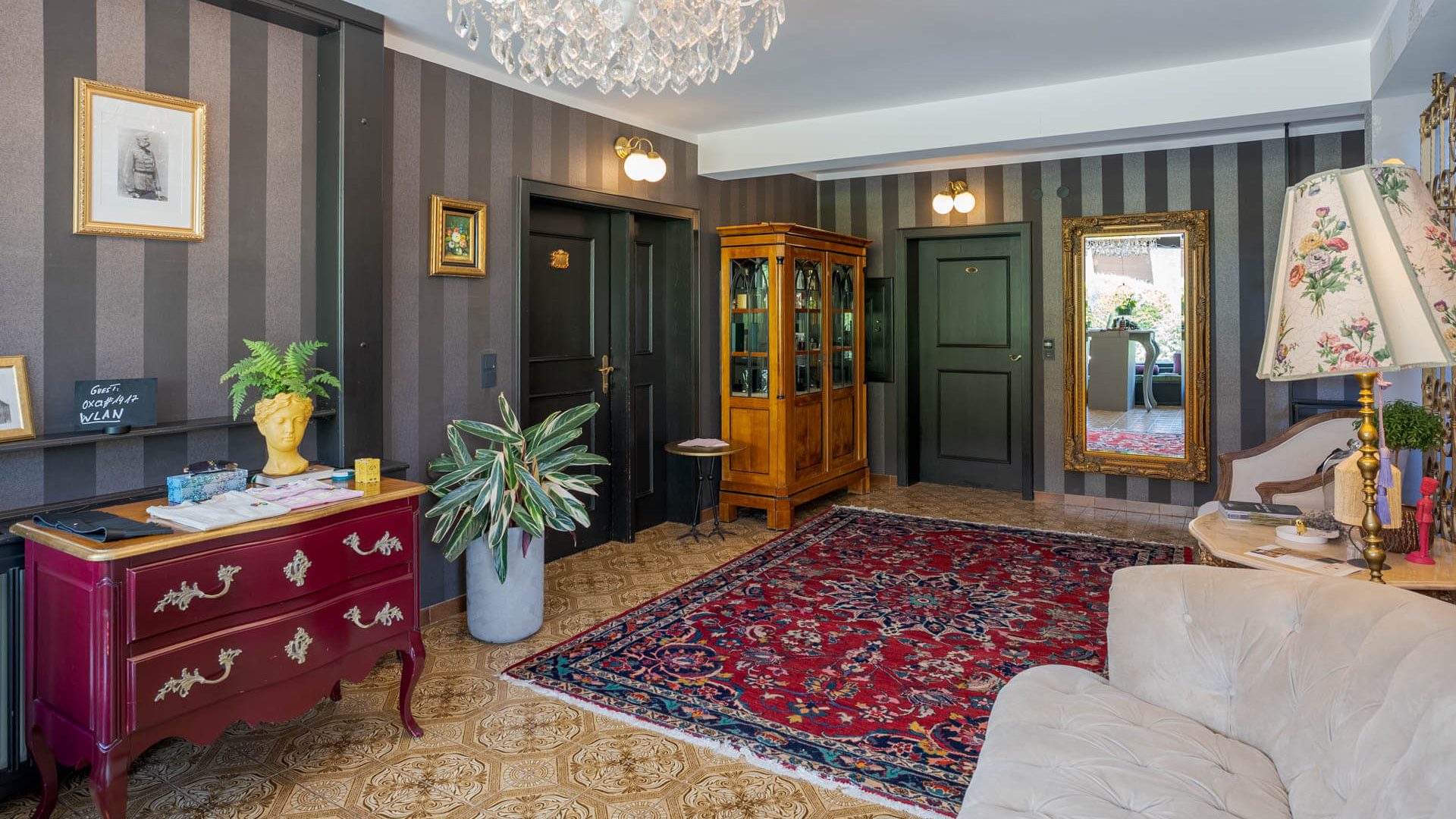 Bunte Sessel vor einem stilvollen Kamin in der gemütlichen Lobby der Villa Oxa.